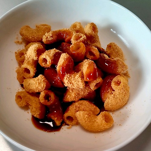 ホットクックで作る保育園で人気のおやつ「マカロニきな粉」 - とろみん家ホットクックレシピ。