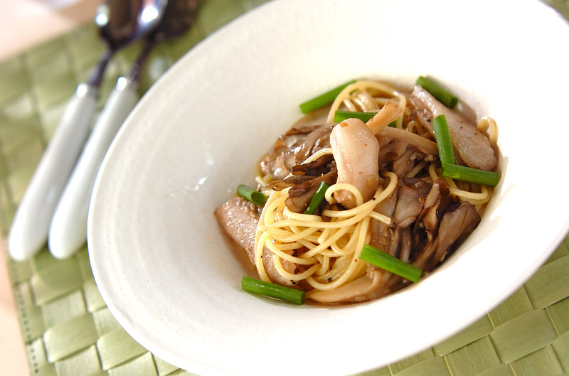 Barあしあと on X: "パスタ。薄切りにした豚トロに春菊とキノコを合わせ、醤油、味醂、ネギ生姜、チーズで和風に仕立てました。 豚トロの脂の旨味に春菊の香り、きのこのコク。お好みでゆず七味を振って。パスタではなく二八蕎麦に変更もできます。 https:t.co。