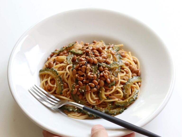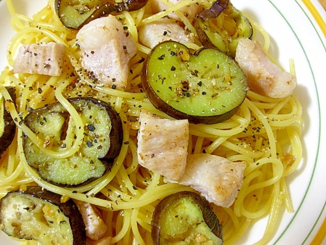 豚トロとなすのしょうゆ糀パスタ。
