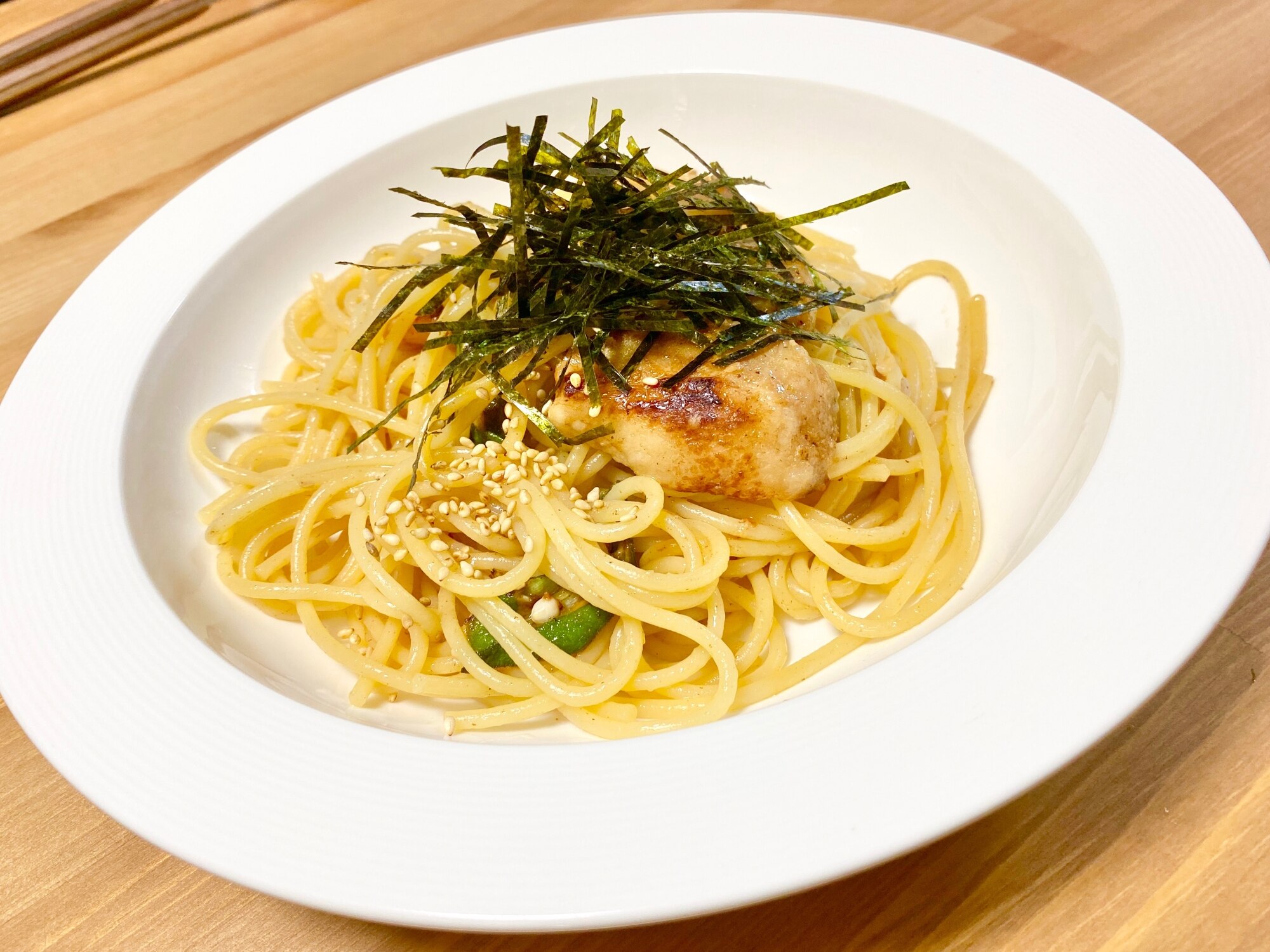 パスタ ゴマ油香る豚トロのペペロンチーノ。