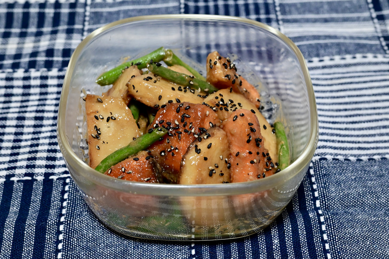 鮭とじゃがいものごま味噌バター炒め。