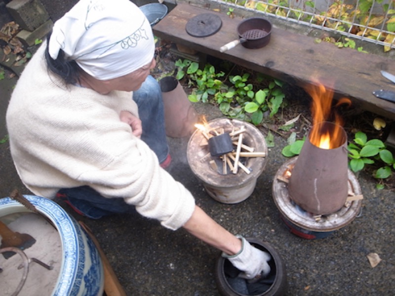 七輪の火おこし。