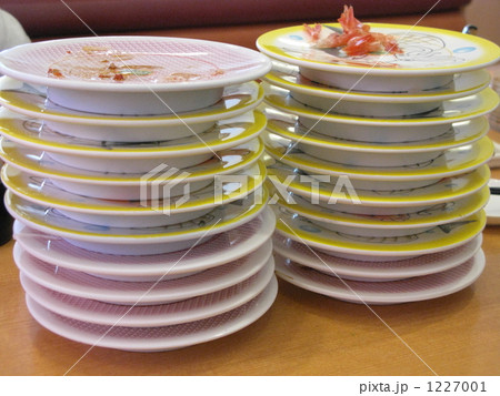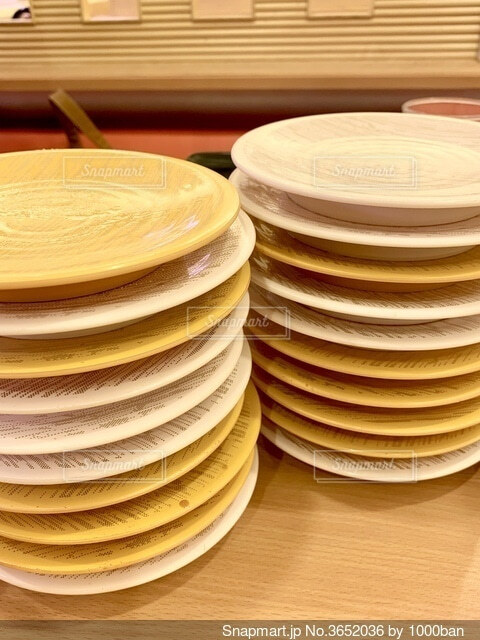積み上げられて重なった回転寿司のお皿の写真・画像素材-Snapmart スナップマート。