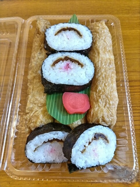 woures熊谷市妻沼1243 小林寿司店 いなり寿司 妻沼名物いなり寿司並べます。 妻沼聖天山近くに3年ある中で、今回初めて食べた小林寿司 店さんのいなり寿司。 妻沼のいなり寿司らしい大きないなり寿司の上に干瓢と桜でんぶの海苔巻きと紅しょうががのっています。