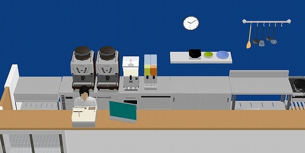 カフェ 3D厨房レイアウト例 - 業務用調理器具、食器洗浄機、冷凍庫など厨房機器∥おいしい厨房。