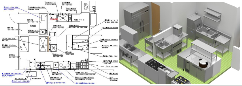 店舗厨房機器レイアウト 設計図とイメージパース。
