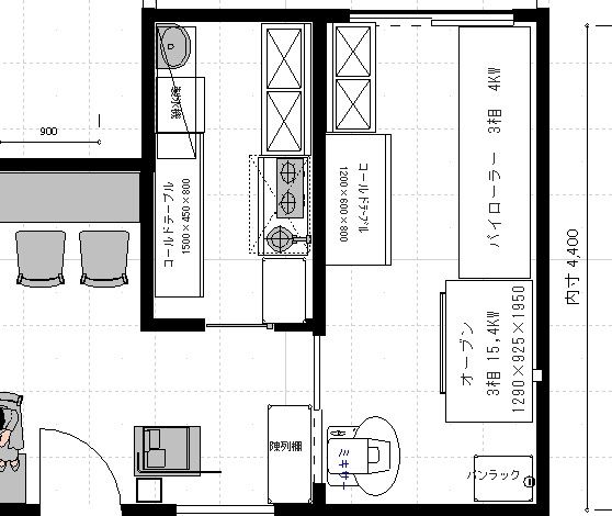 カフェベーカリーパン屋の厨房設計レイアウト図面飲食店の内装工事と厨房機器。