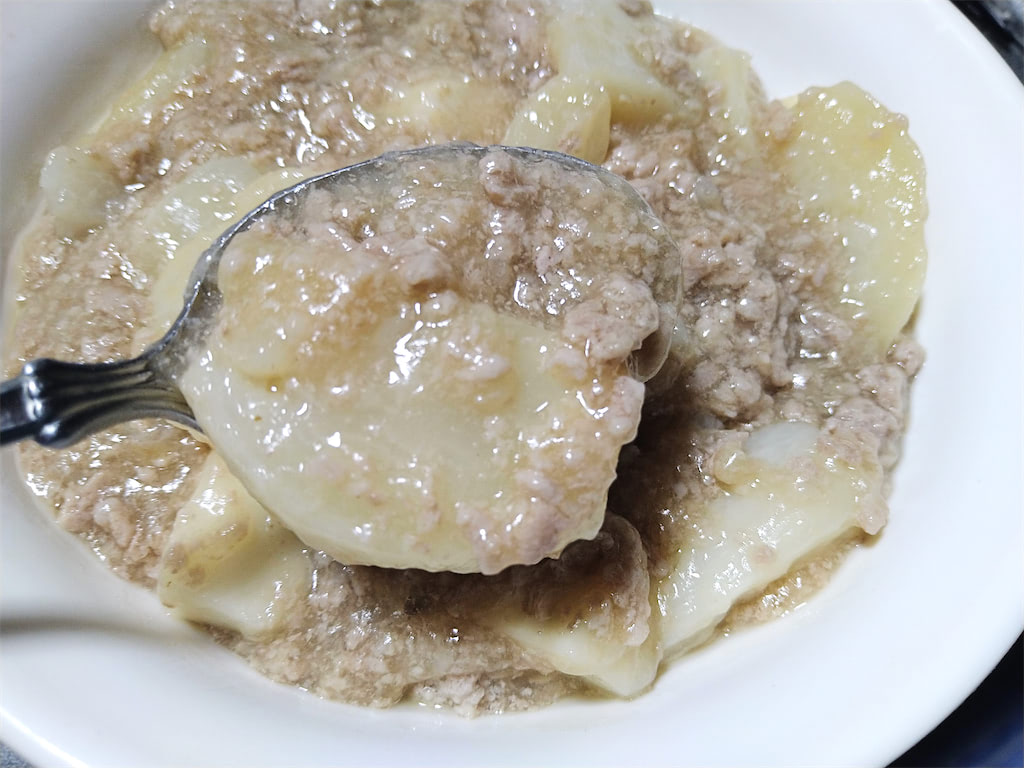 めんつゆで豚ひき肉とじゃがいも煮。
