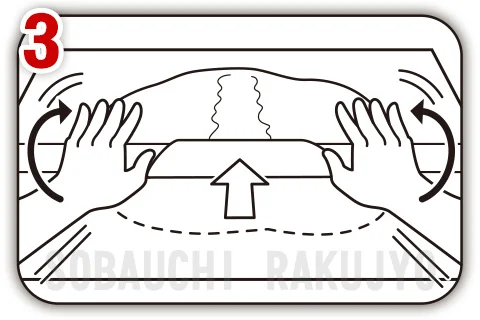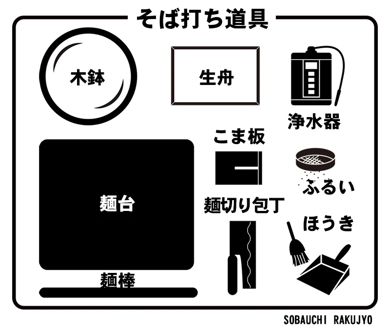 イラストでそば打ちレシピ 基本4ステップ出張そば打ち体験~SOBAUCHI 楽常~。