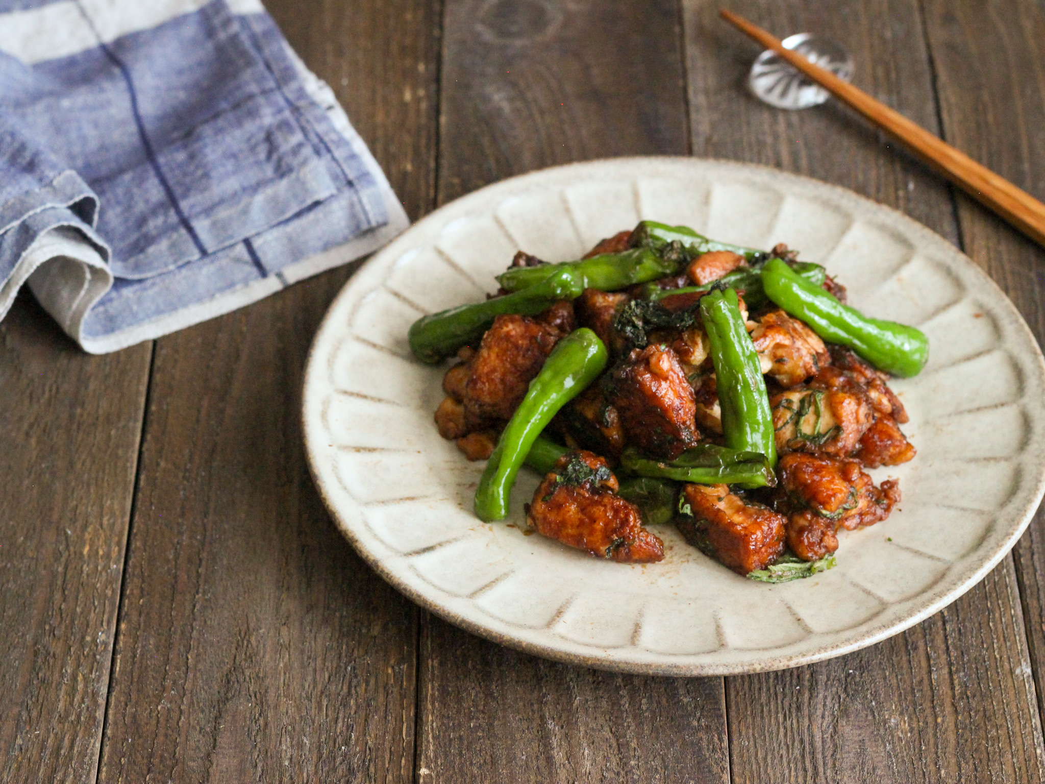 鶏もも肉とししとうのニンニク味噌炒め。