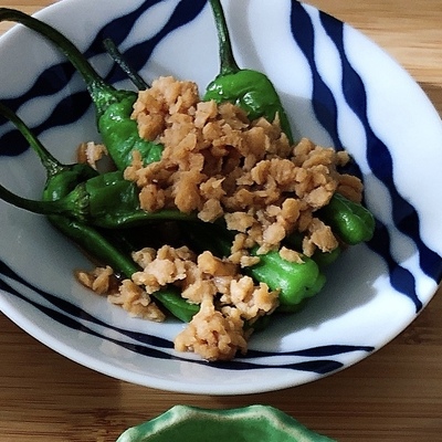 ししとうと大豆ミートの味噌炒め。
