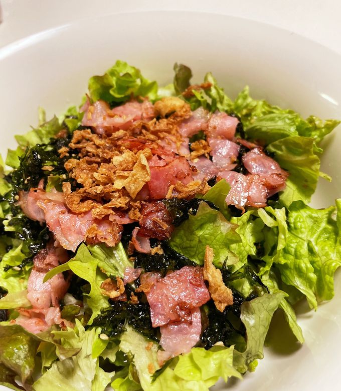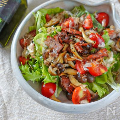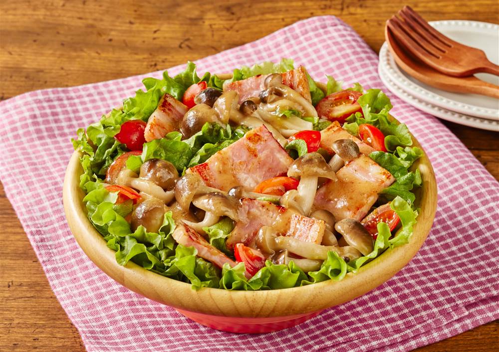 リーフレタスとソテーきのこと厚切りベーコンのサラダ。