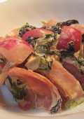 「 簡単なのに美味すぎる ベーコンのカルボナーラサラダ」材料4人分サニーレタス50g 無塩せきショルダーベーコン100g にんにく1片A卵1個 A粉チーズ20g A牛乳大さじ2 EXVオリーブオイル大さじ1 塩ひとつまみ 黒こしょう少々 全体に満遍なく作り方1.サニーレタスを一口大にちぎり、水にさらしておく。その後水気を切る。。