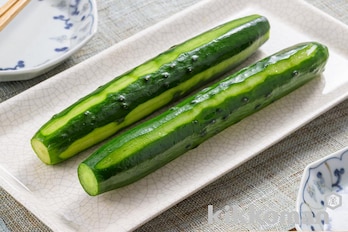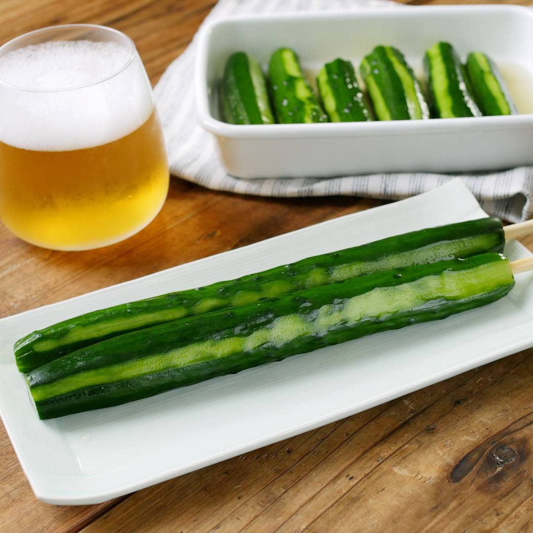 まるごと1本。じゃばらきゅうりの白だし漬け , きゅうりを切って、白だしに漬けるだけ。, ほんのり香る柚子胡椒が、大人の夏にぴったりの味わいです。,\じゃばら切りって? , きゅうりに斜めの切り込みを細かく入れて、, 裏返して反対側にも同じように切り込みを。,断面が増えることで、味がよくしみ込みます。,材料2〜4人分 , ・きゅうり 2本 じゃばら切りにして1本を4等分 ,。