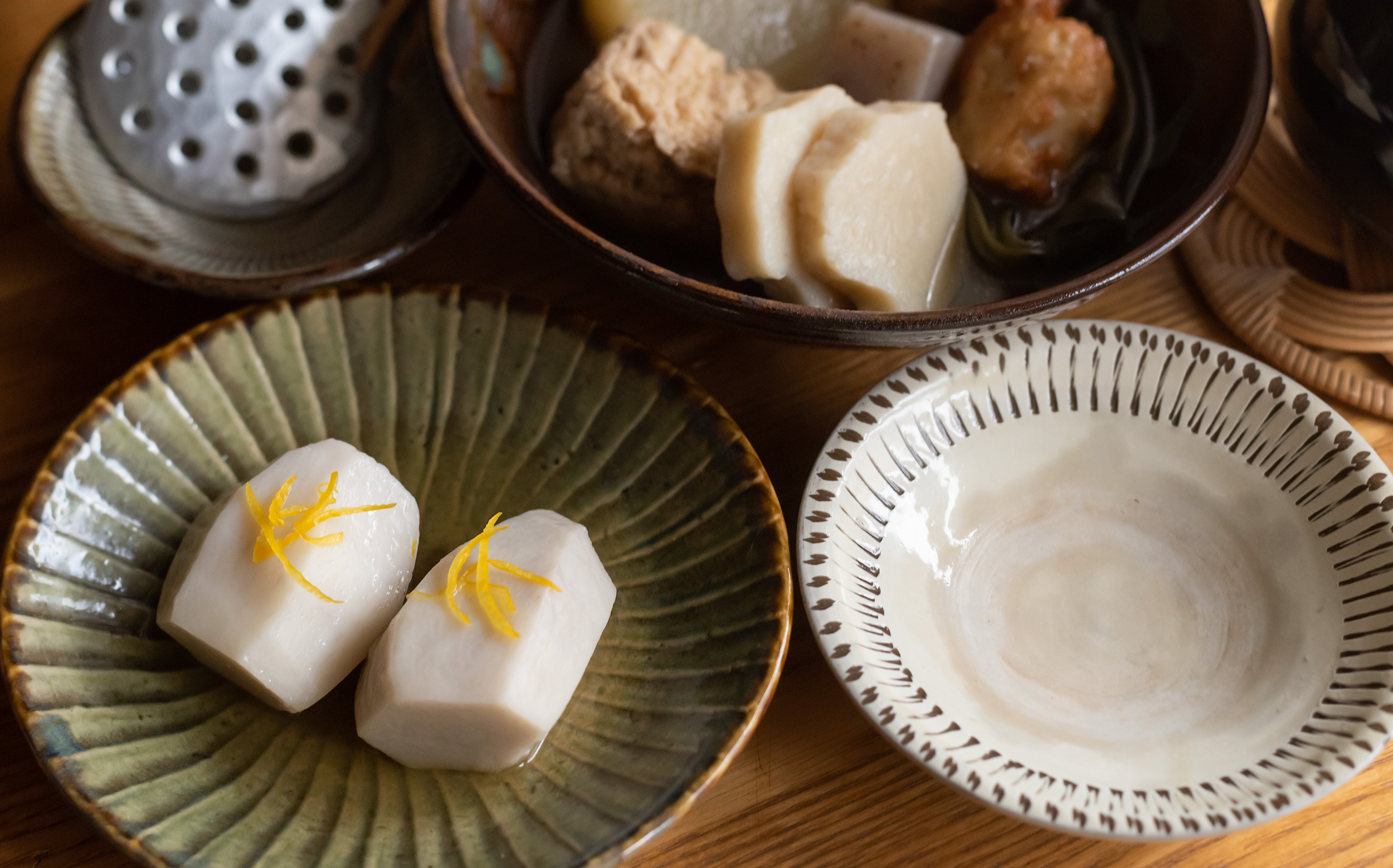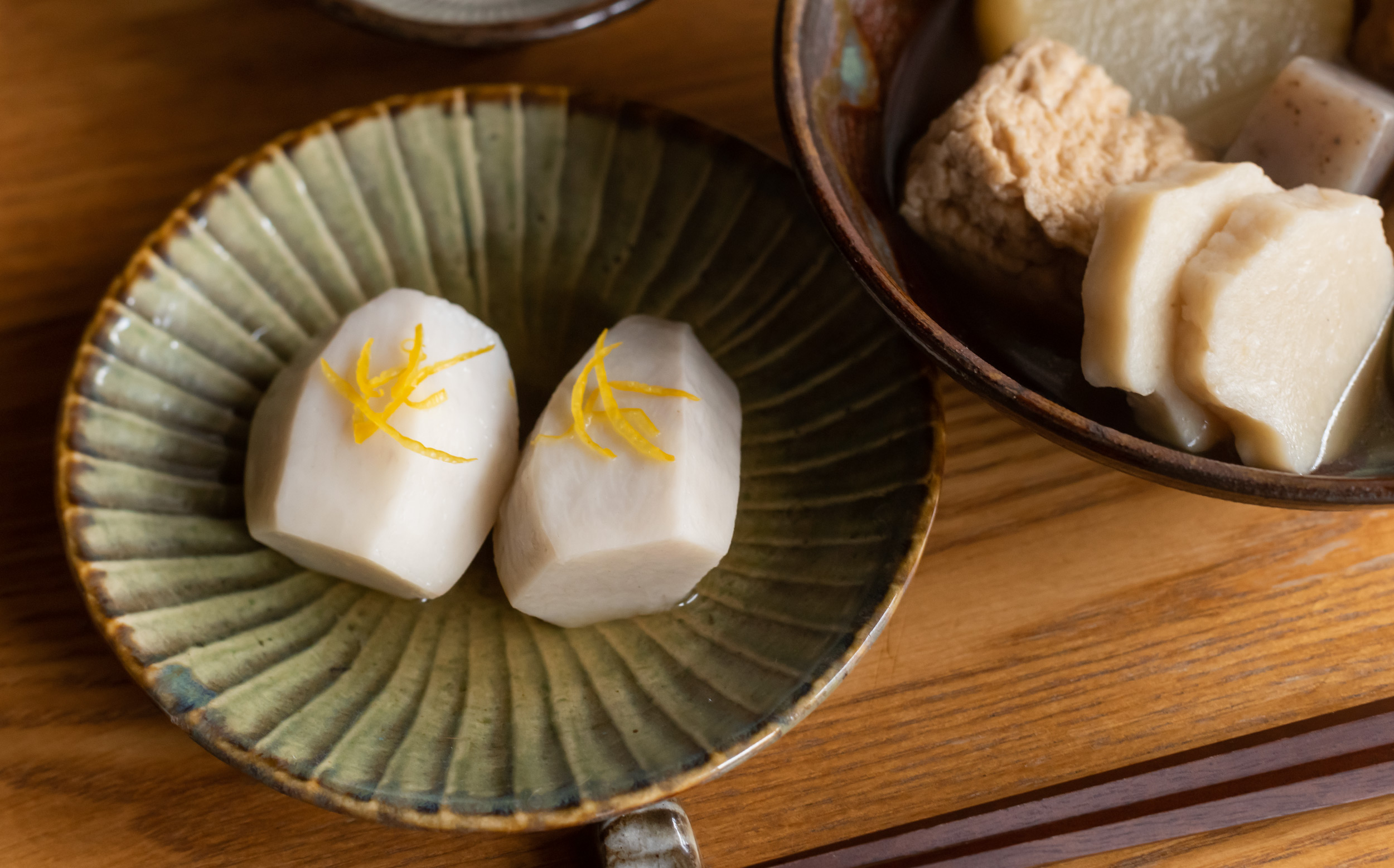 聖護院大根と京人参と海老芋のおでん洛市は京都の伝統と文化をお届けします。