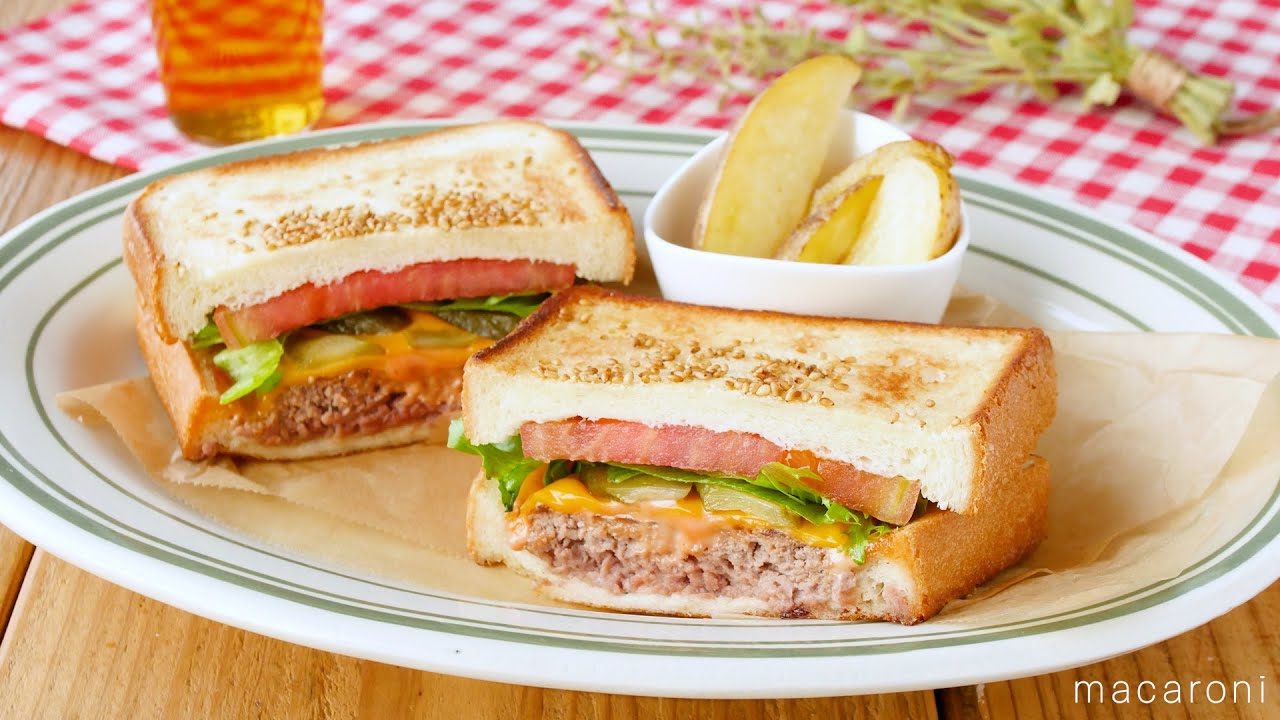 ハンバーガーホットサンド フライパンで完成!ホットサンドメーカー不要♪カリッと焼けた食パンと肉感のあるミートパティが絶品macaroni マカロニ。