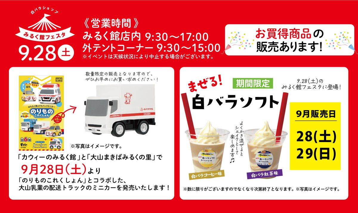 大山乳業 白バラ牛乳公式on X: "\9 28 土 みるく館フェスタ開催のお知らせ土日限定で好評発売中の『まぜる!白バラソフト』や、「のりものこれくしょん」とコラボした大山乳業の配送トラックのミニカーを。