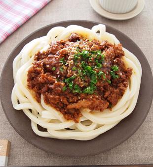 市販ハンバーグで簡単!デミグラボロネーゼうどん。