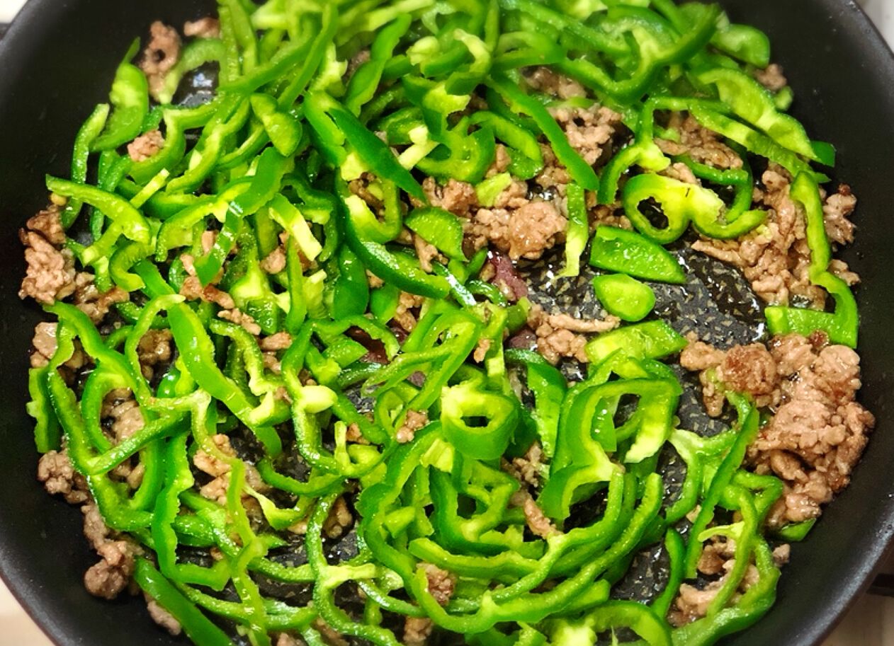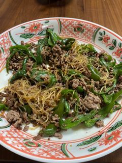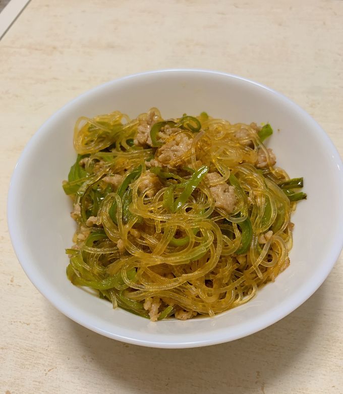ピーマン、ひき肉、春雨の炒め物。