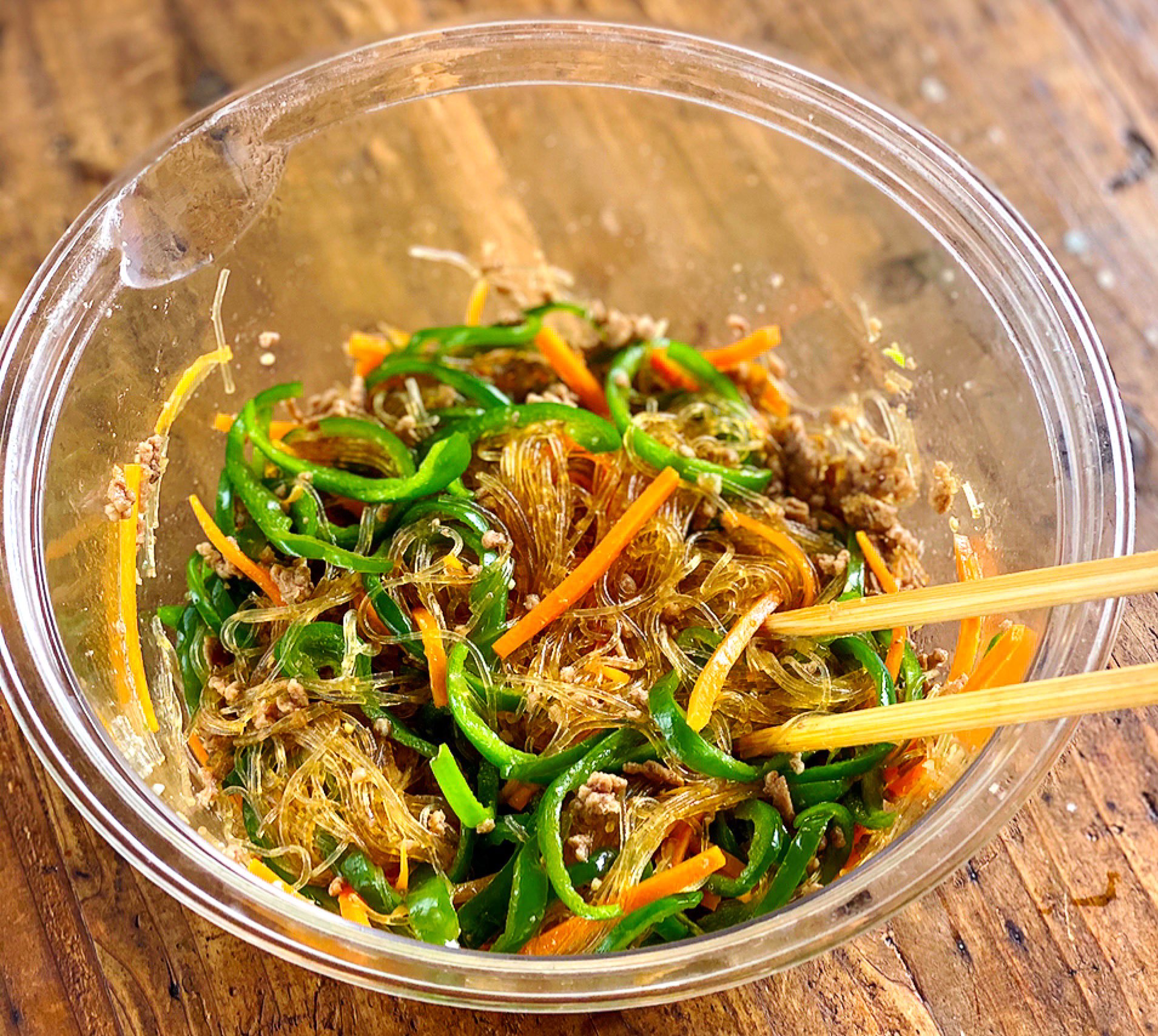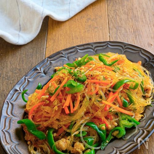 ひき肉・人参・ピーマン・春雨で作るチャプチェ。