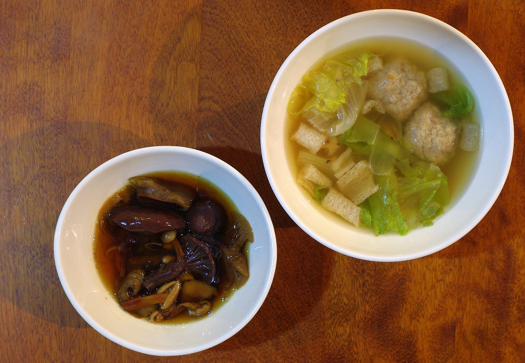 スッポンタケは味噌汁。ハナビラニカワタケとシロキクラゲは、生姜の甘酢漬けとポン酢で😋。