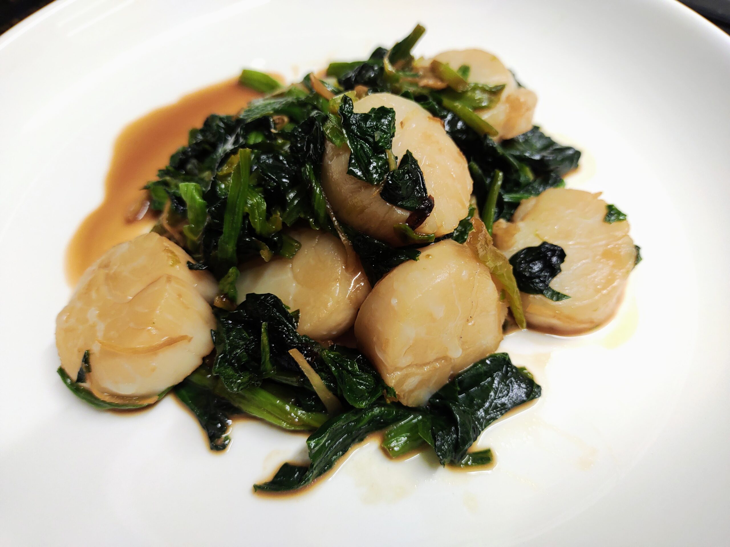 ホタテとほうれん草の生姜醤油炒め。