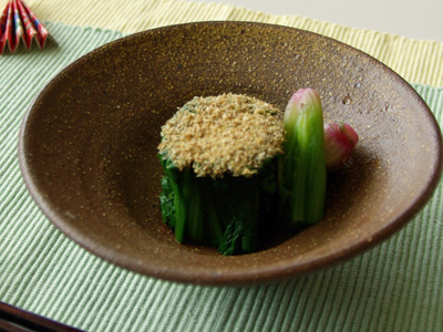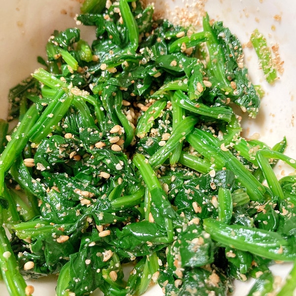 菜の花とほうれん草の薬膳胡麻和えお料理レシピユワキヤ醤油・味噌大分。