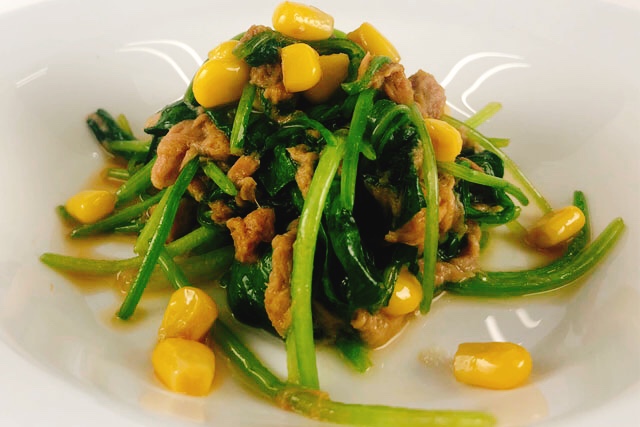 「ほうれん草と産直豚バラ肉のバター醤油炒め」、「貝柱入り豚肉しゅうまい」、「れんこんサラダ」、「北海道コーンがおいしいスープ」 3人分。