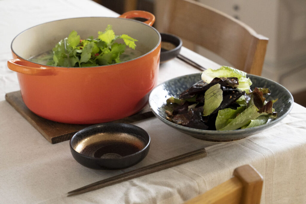 グルグルグリーンカレー鍋、ロメインレタスのエスニックサラダの献立坂ノ途中100年先もつづく、農業を。