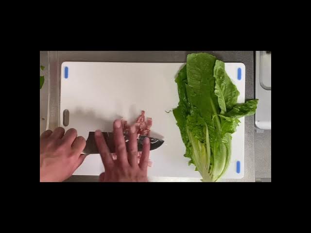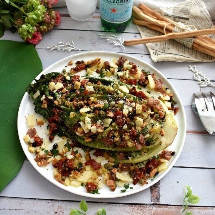 焼きロメインレタスのシーザーサラダ , みずみずしく、シャキッとした噛みごたえが特徴的な, ロメインレタスを使った,シーザーサラダをご紹介します😊, ベーコンを一緒に炒めてボリューム満点!, とってもヘルシーなのに食べ応えのある一品です!,是非作ってみてくださいね✨,材料2人分 , ロメインレタス1 2個, ハーフベーコン4枚,。