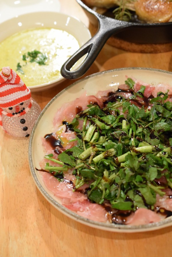 大好き!鯛のカルパッチョ、生ハムとクレソンのせ、バルサミコソースかけ来年こそ、料理を日常作る年にしたい人は「パパの料理塾」。1月17日 水 第1回開講: ビストロパパ ~パパ料理のススメ~。