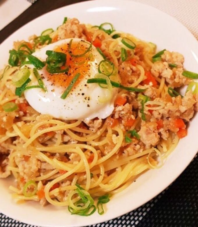 温玉乗せ!鶏そぼろの和風ボロネーゼ。