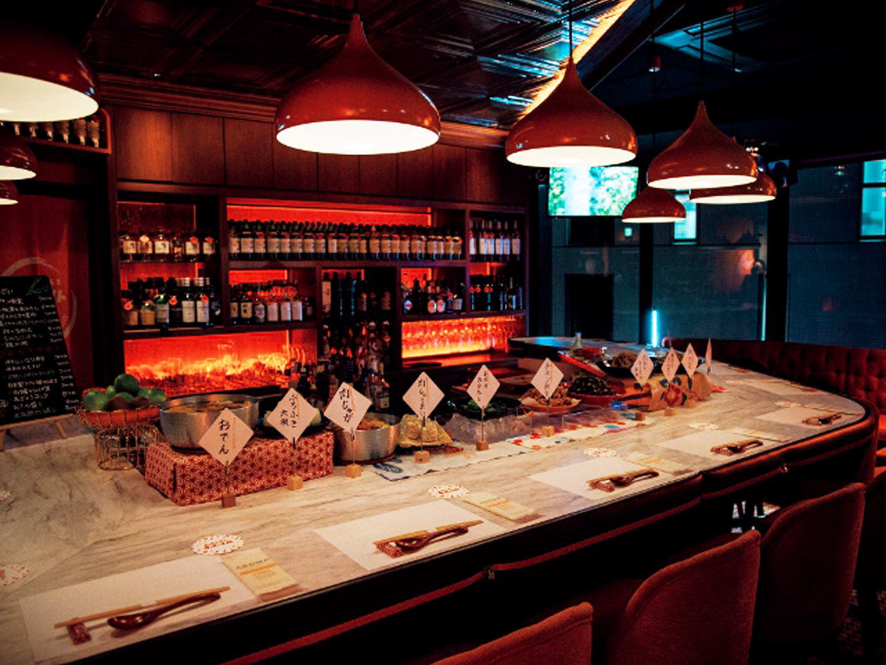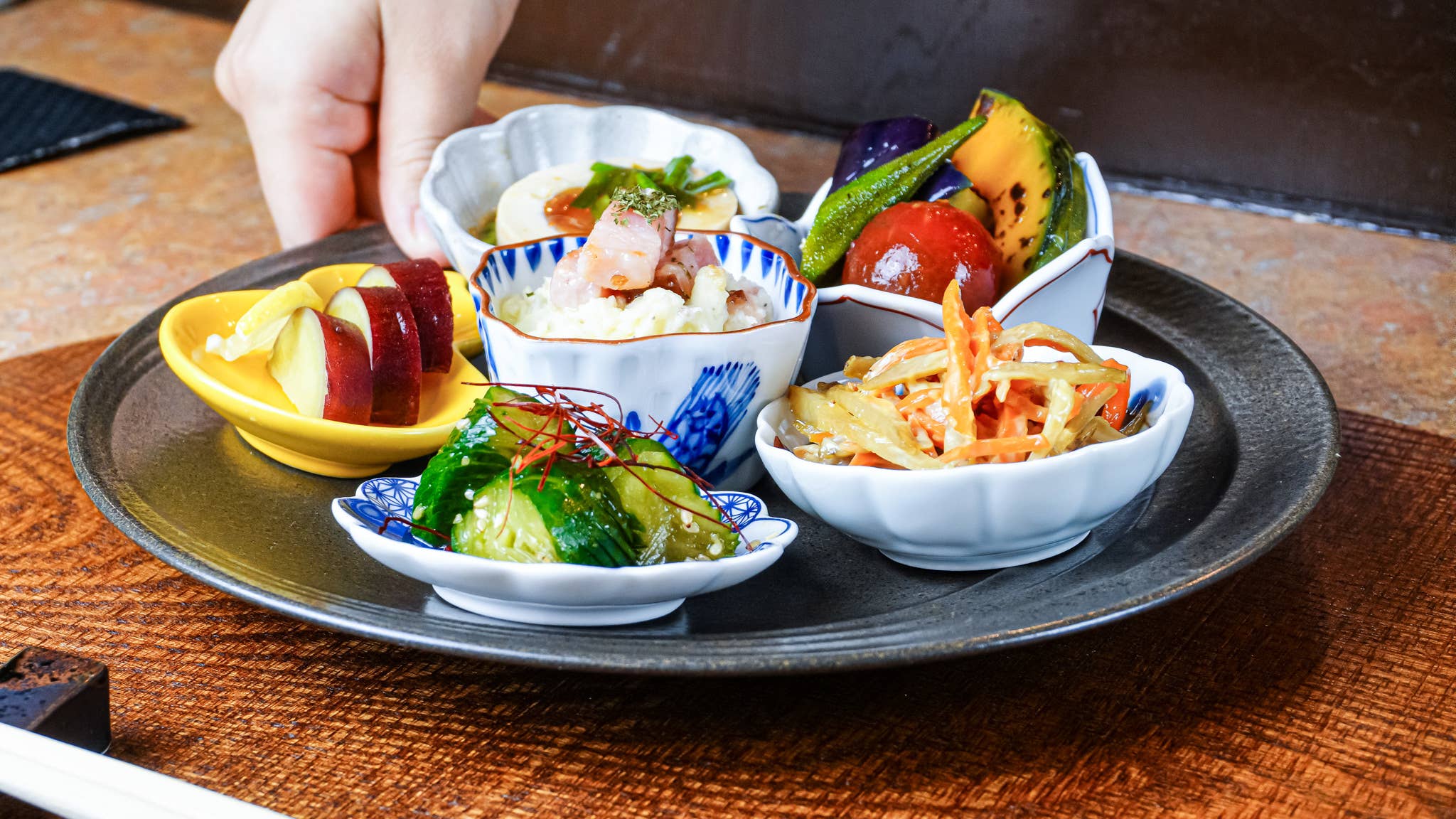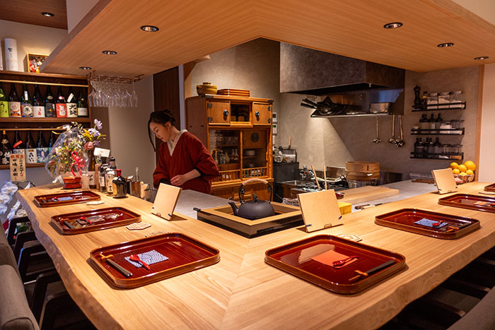 カウンターに並ぶおばんざい和食料理教室を営む女将による、 日替わりのおばんざい。 これらは厳選された発酵調味料と 季節の食材を使い、毎日丁寧に出汁から仕込みます。 おばんざいおかわり自由のコースでは、 お好きなものを何度でもお腹が満たされるまでどうぞ。