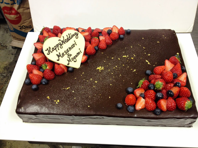 生チョコ&生クリームウエディングケーキ 苺の飾りに生チョコと生クリームのハーフ&ハーフのウエディングケーキをオーダーいただきました。 どちらを食べても美味しいです。 皆様に喜んでいただけるウエディングケーキを作れて幸せです。 これからも。