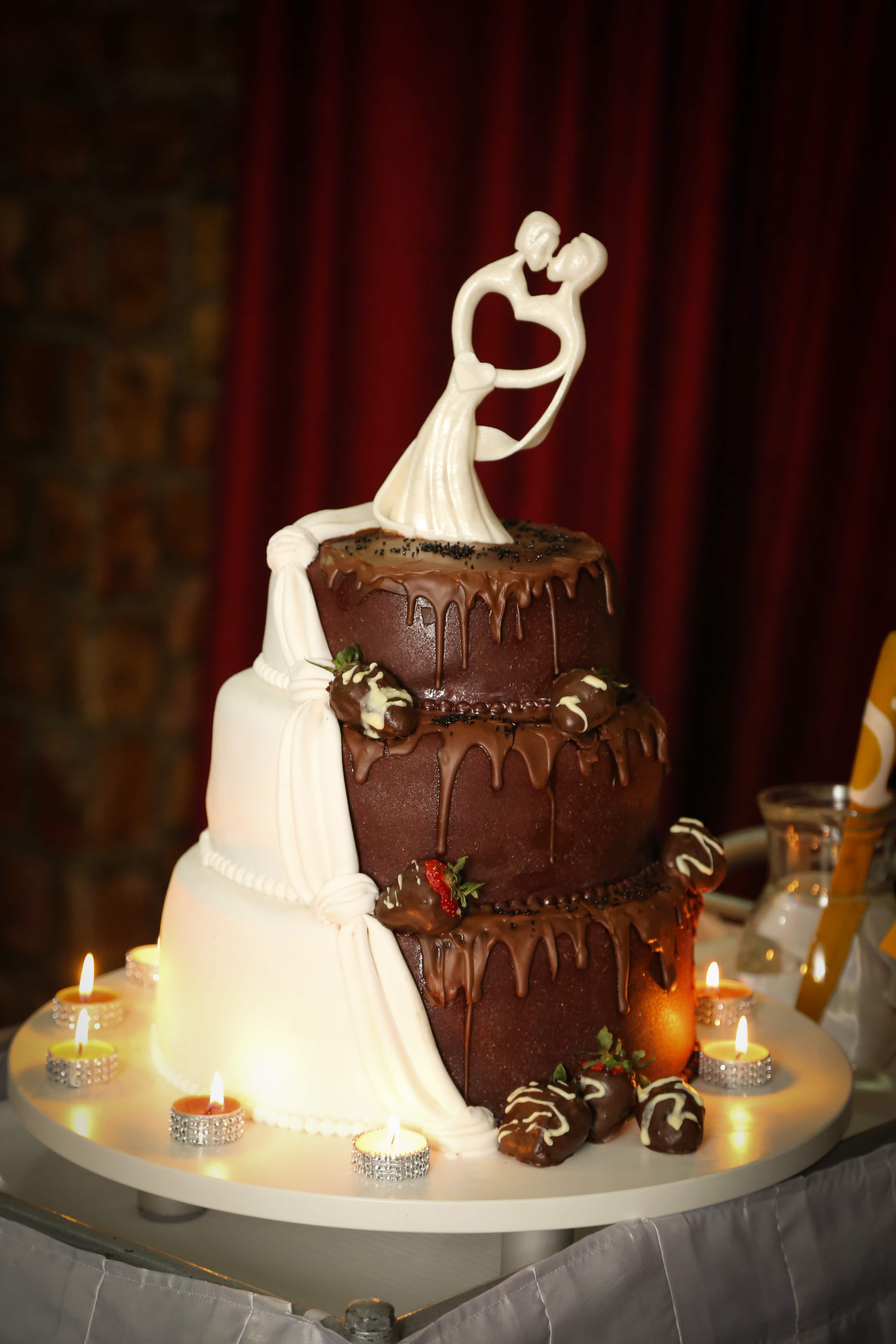 フリー写真画像: ロマンチックです, キャンドル, ウエディング ケーキ, チョコレート ケーキ, キャンドル, 高級, チョコレート, お祝い,結婚式, インテリア デザイン。