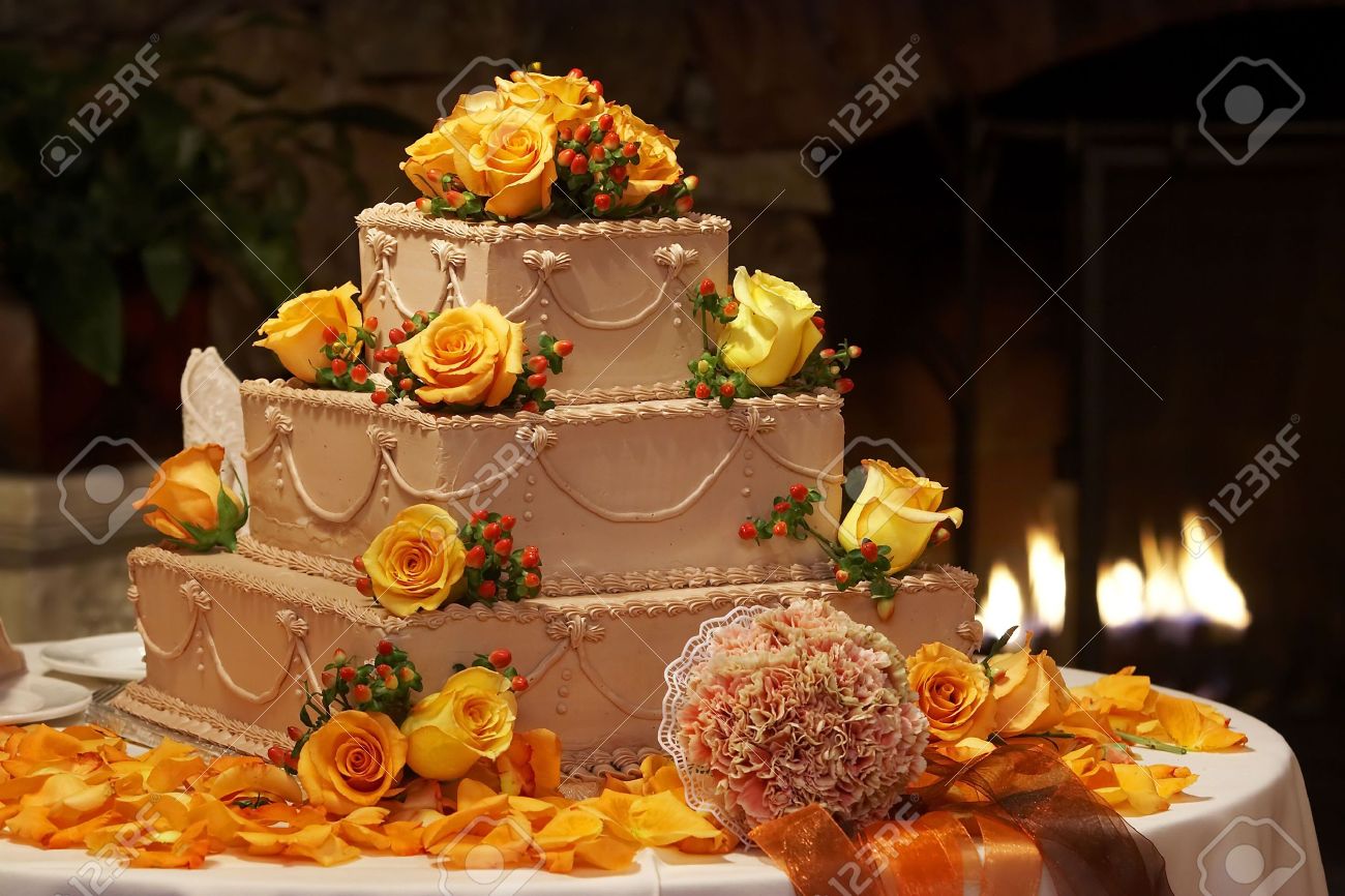 バラの花びらと花の花束を花嫁によって囲まれたチョコレートのウエディング ケーキ。座って、バック グラウンドで火を持つテーブル。オレンジ色のバラと、ケーキの上のニースの詳細です。の写真素材・画像素材Image 626942。