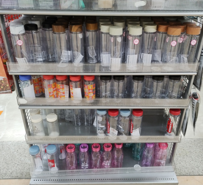 ダイソーの無地ドリンクボトルがキッチン収納に便利!中栓付きで計量もラクラクえんウチ。