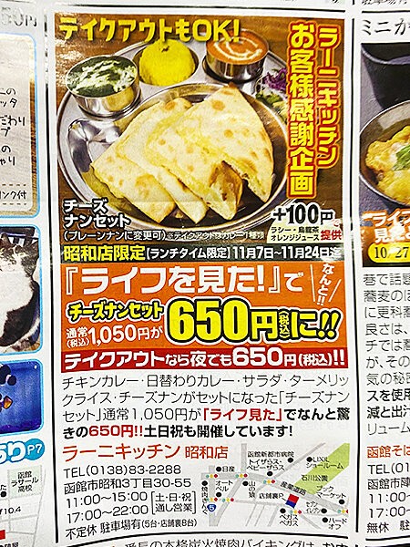 函館市昭和3丁目ラーニキッチン昭和店 その5 「ライフを見た!」でなんと!!チーズナンセット通常 税込み 1,050円が650円 税込み に!! :函館無限1up。