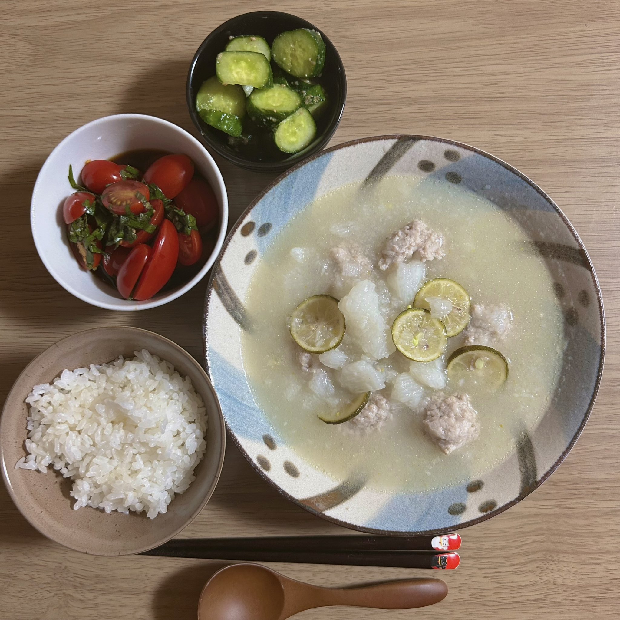 鶏団子とたたき長芋のお鍋 夏鍋、しみる。