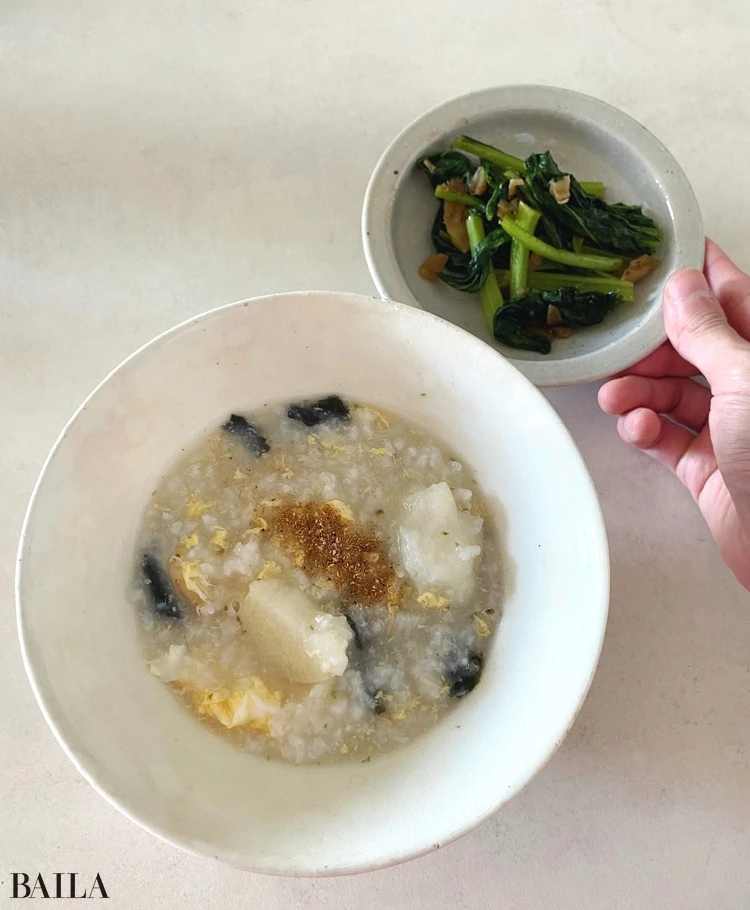 長谷川あかりのご自愛ごはん vol.22 栄養満点でほっこり温まる「長芋とたまご、海苔の中華粥」@BAILA。