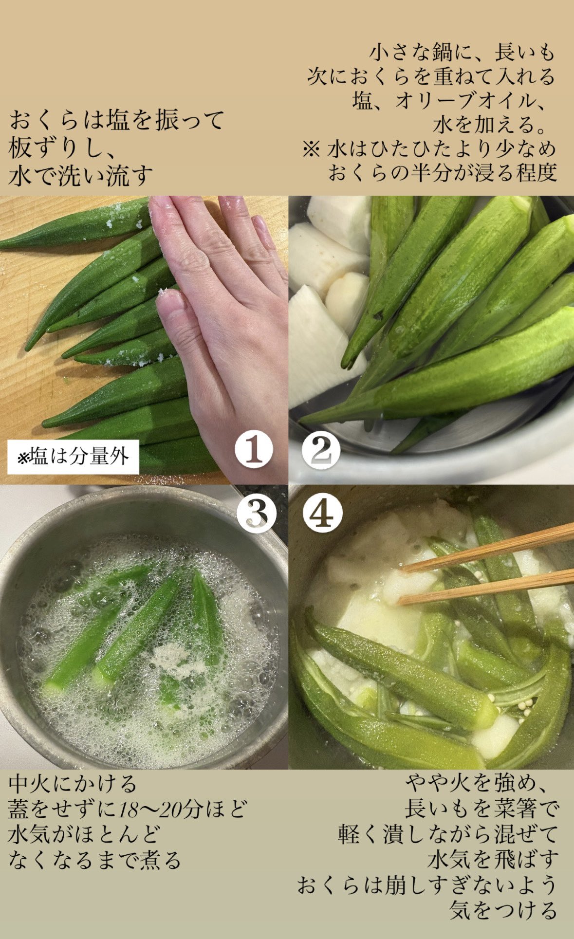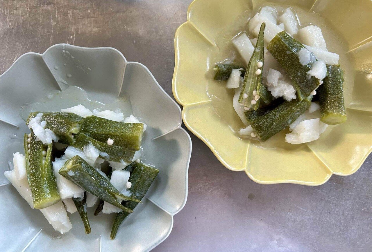 長谷川あかり on X: "おくらと長芋のくたくた、夏養生のとろける副菜です。おくら、長芋といえば夏に美味しいねばねば食材の代表ですが、蓋をせず水からじっくり加熱すると、ほくほくとろける口当たりの万能副菜になるんです。塩とオイルだけの余白ある味付けなので、和洋。
