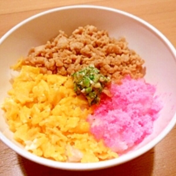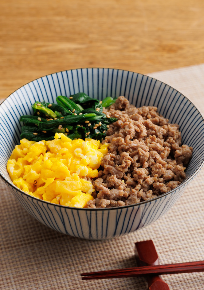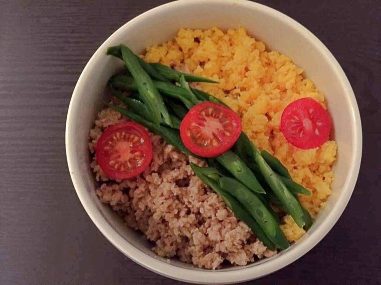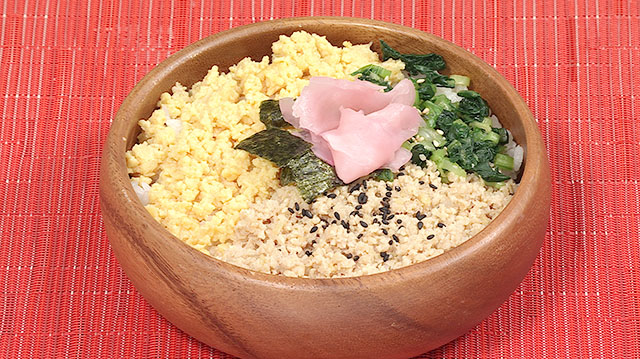 しっとりそぼろの三色丼。