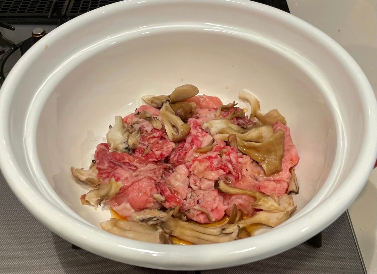 下味冷凍 牛肉とまいたけの簡単やわらか煮。