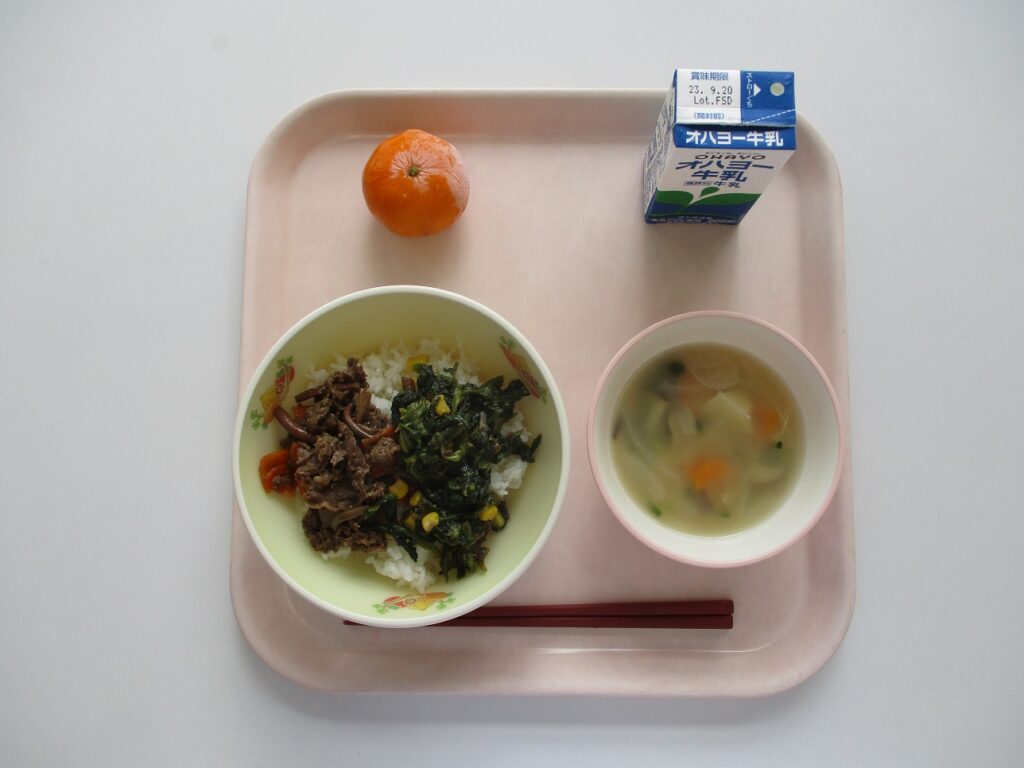 目黒区立菅刈小学校学校日記9月16日 キムチチャーハン トックスープ ぶどう 牛乳。