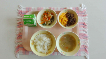 5月26日 牛乳 ごはん プルコギ トックスープ ショーロンポー 泉佐野市。