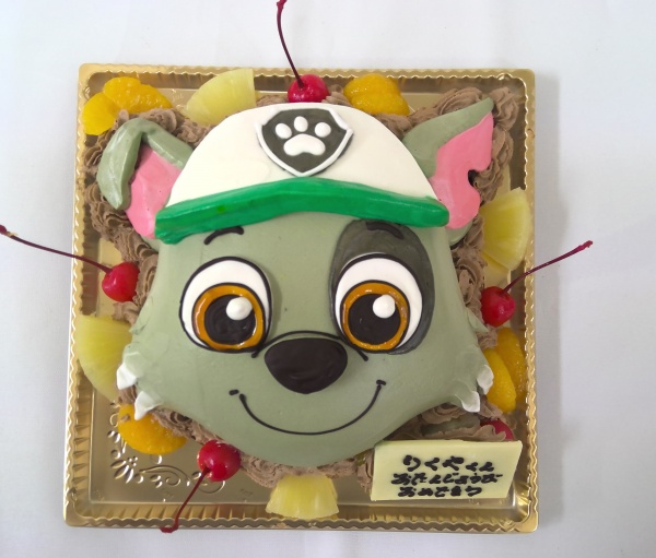 通販ケーキで、パウパトロールのロッキーの顔を立体形ケーキで大阪市東住吉区パティスリーデコ。