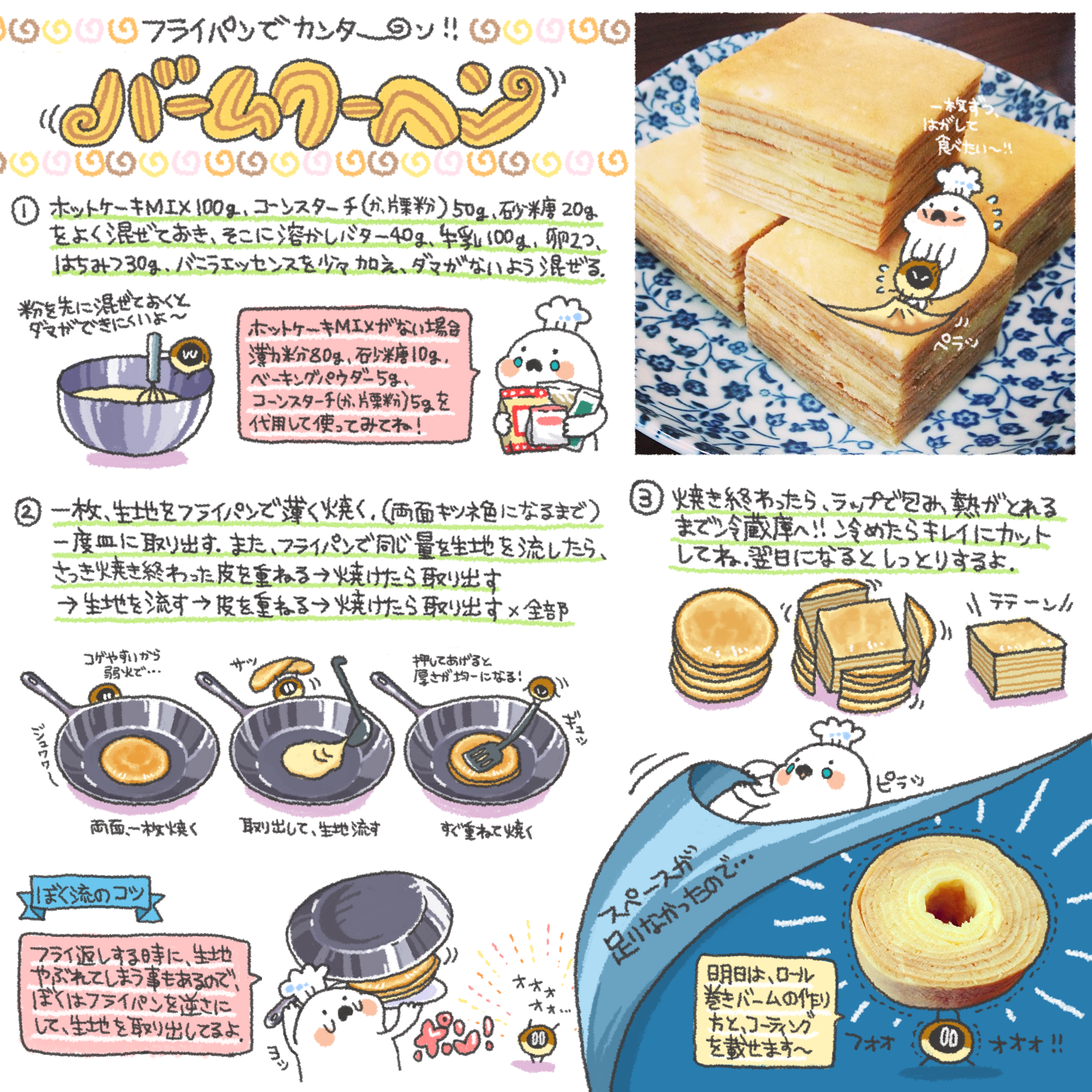 ぼく・イラストレシピ on X: "フライパンでかんた~んバームクーヘンレシピ_ OO」∠ _まとめました!http:t.co oUIJs0Y0wK"X。