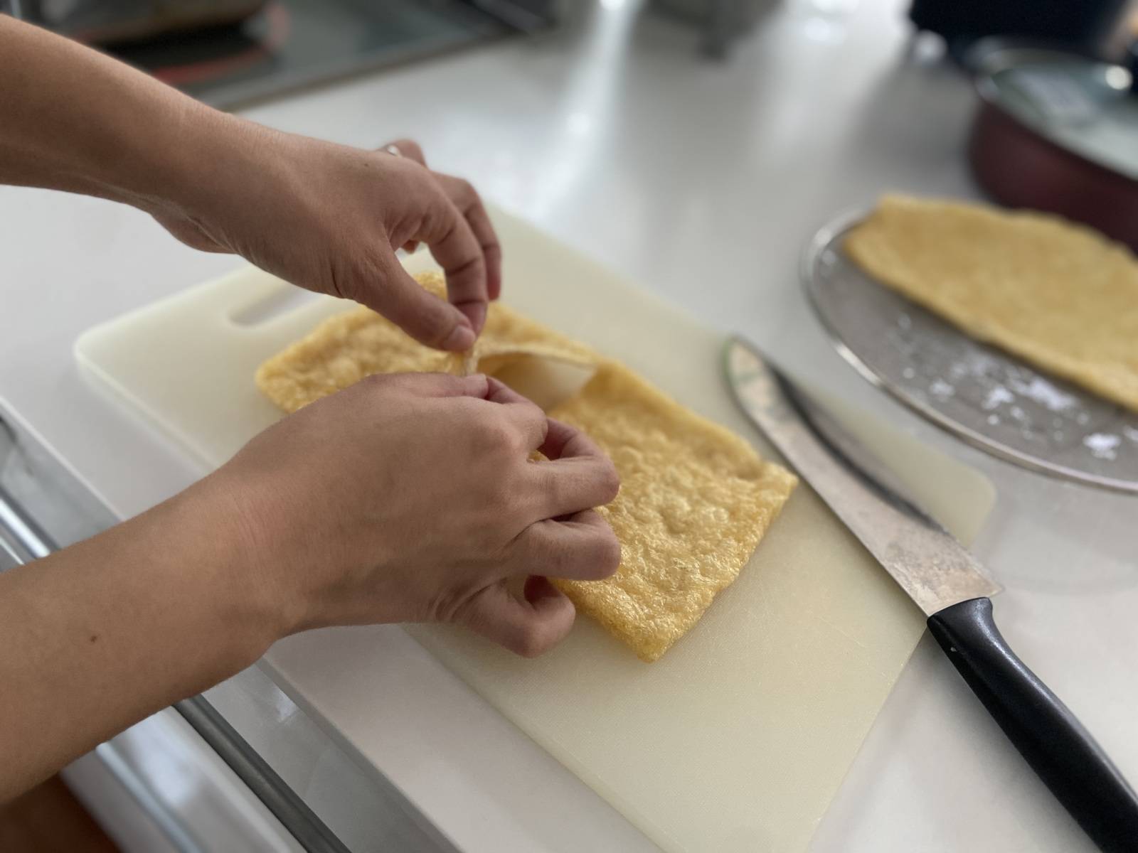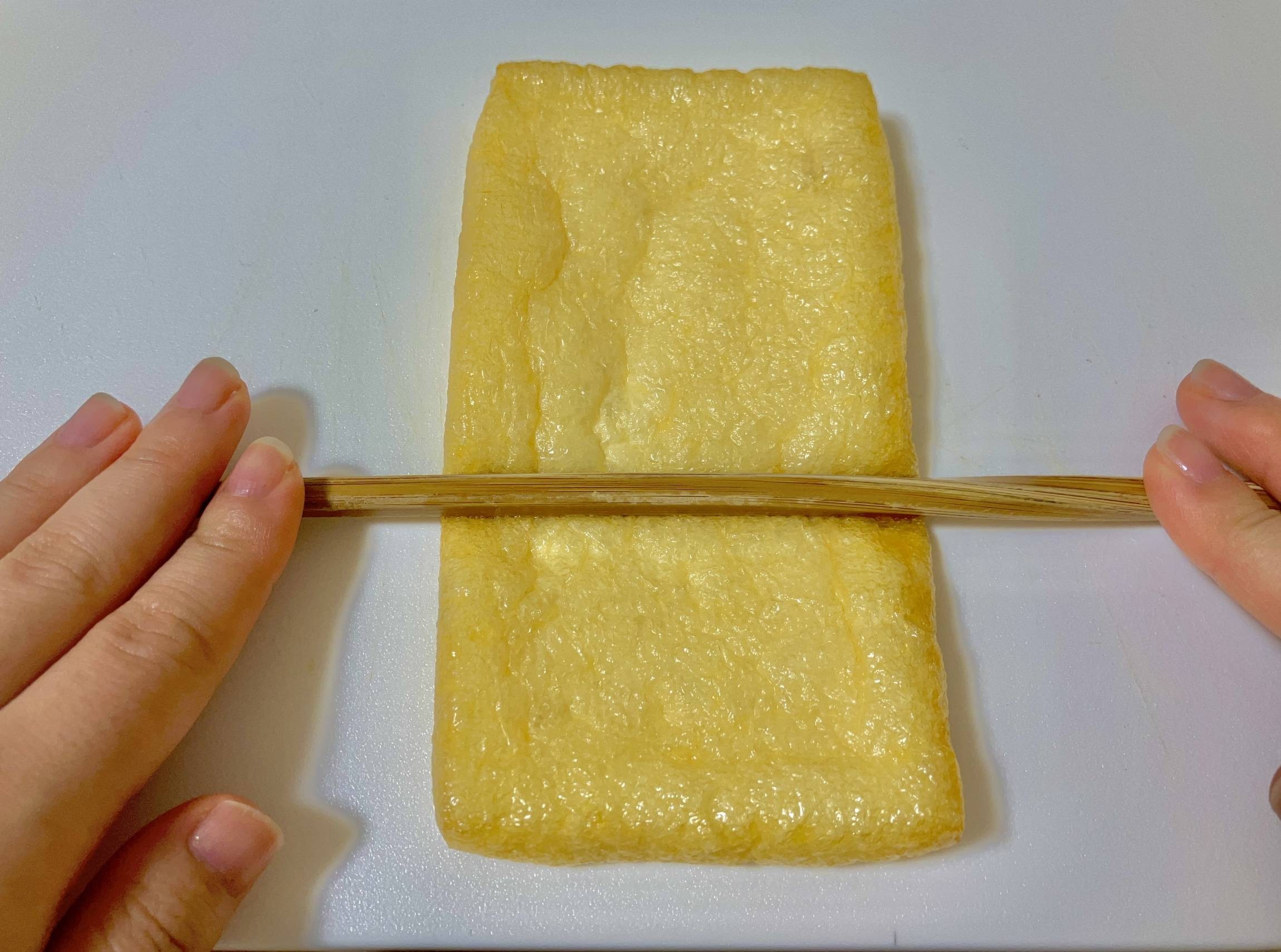 油揚げの開き方!袋状にきれいに開くには箸を押し当てて転がす。やまでら くみこ のレシピ。