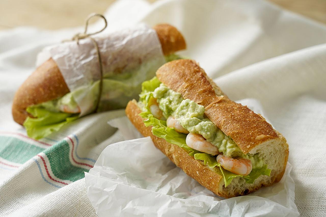 冷凍アボカドペーストでえびアボカドサンド。