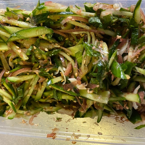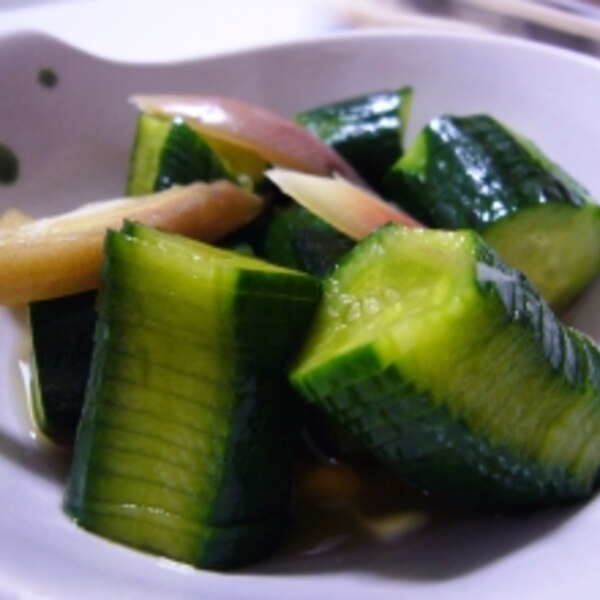 たたききゅうりとみょうがと紫蘇のやみつき漬け。